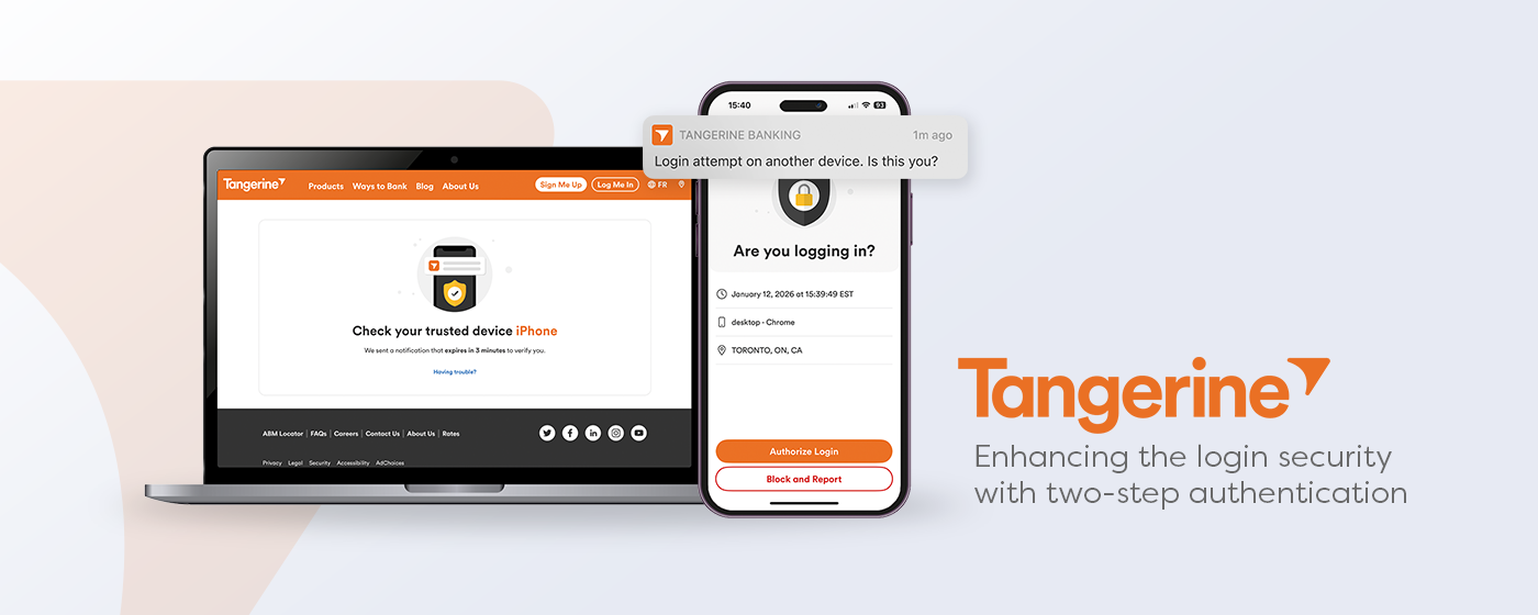 The login experience at Tangerine relied on a one-time security code sent via SMS along with secret questions. While this approach functioned as intended, it carried inherent vulnerabilities that increased the risk of account takeovers, ultimately contributing to significant fraud losses.